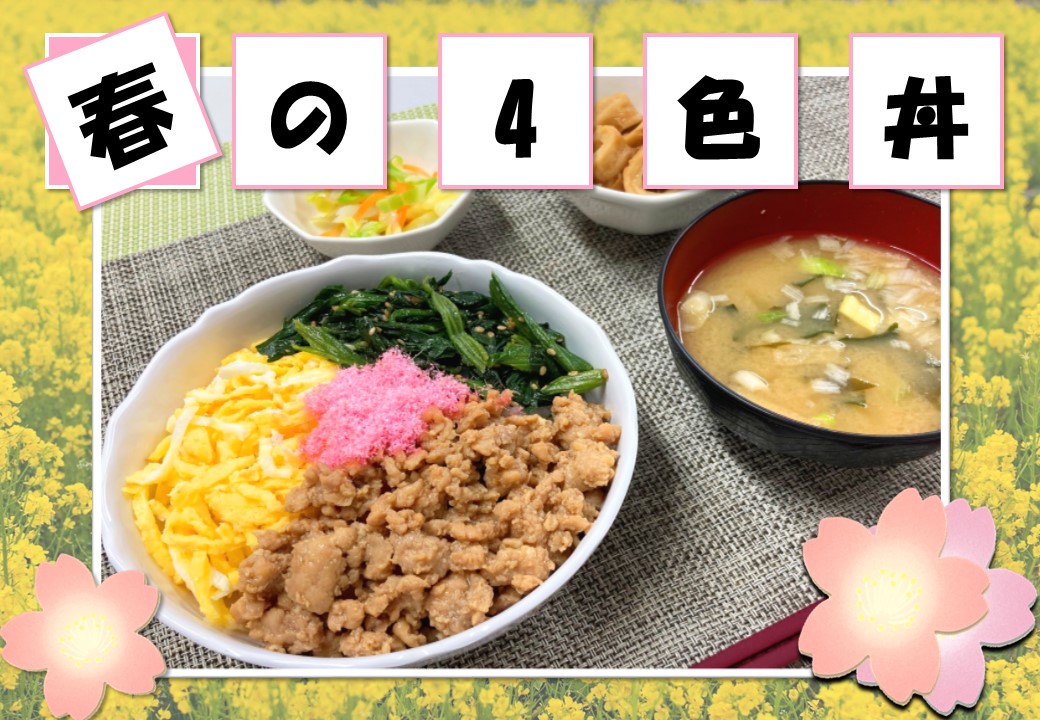 4月11日(木)の夕食は「春の4色丼」となっております。春らしい色鮮やかなどんぶりとなります。ぜひご賞味ください。